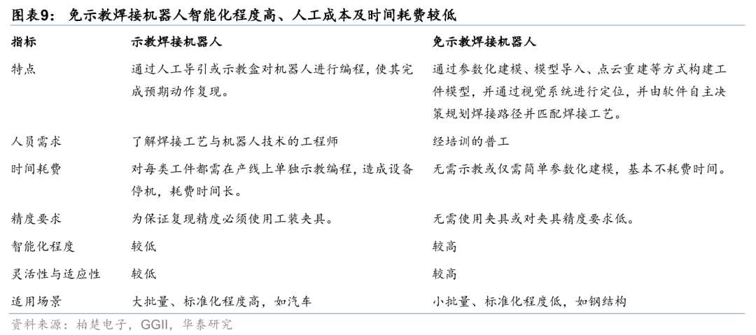 焊接机器人从示教“进化”为免示教,更适用于非标场景。传统的示教焊接机器人依赖人工导引或示教盒对机器人进行编程,使其完成预期动作复现。而免示教焊接机器人在构建工件模型后通过视觉系统对工件与焊缝进行定位(类似人的“双眼”),并由免示教软件系统自主决策规划焊接路径并匹配焊接工艺(类似人的“大脑”),减少人工示教编程的时间成本及人员耗费。免示教机器人对工件种类、摆放位置等要求较低,灵活性、适应性及智能化程度较高,与非标件的柔性生产场景适配度较高。在“机器替人”大背景下,免示教焊接机器人在钢构、船舶等领域的应用是大势所趋。